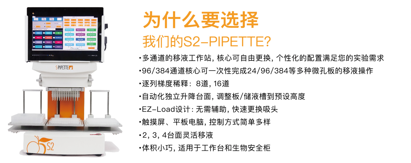 全新的S2-PIPETTE是專為96/384孔板設(shè)計(jì)的高精準(zhǔn)移液平臺(tái),其體積小巧、功能全面、性價(jià)比高。 作為2017年美杏高德明星產(chǎn)品,一經(jīng)上市就獲得客戶青睞??蛻裟軌虮憬莸卦趯?shí)驗(yàn)室、通風(fēng)櫥、超凈 臺(tái)和生物安全柜等內(nèi)完成多種實(shí)驗(yàn),如細(xì)胞培養(yǎng)、Elisa、整板轉(zhuǎn)移。效率高、精度準(zhǔn),S2-PIPETTE 將是您更好的選擇!