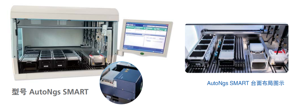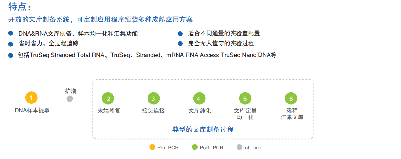 在二代測序(NGS)整個實驗流程中,耗時最長的過程是文庫構(gòu)建,重復(fù)性操作較多,而且大部分工作涉及液體處理,使用NGS工作 站進行文庫構(gòu)建,不但減少了手工文庫構(gòu)建的時間,極大提高了工作效率,而且增加了結(jié)果的重復(fù)性和均一性,在微量樣本匯集過程中也起到了手工操作無法替代的作用。支持的樣本類型包括片段化DNA、gDNA、cDNA和擴增子,可進行從末端修復(fù)到PCR富集的整個流程。